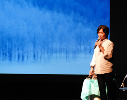第1部は札幌在住の自然写真家、山本純一さんが知床の野生生物などのスライド約100点を投映し、道内の自然の魅力について話しました。野付半島に接岸した流氷と星空を1枚に収めた作品は「流氷の上で一晩中、待機して撮影した」と紹介。